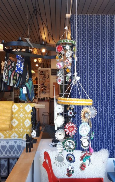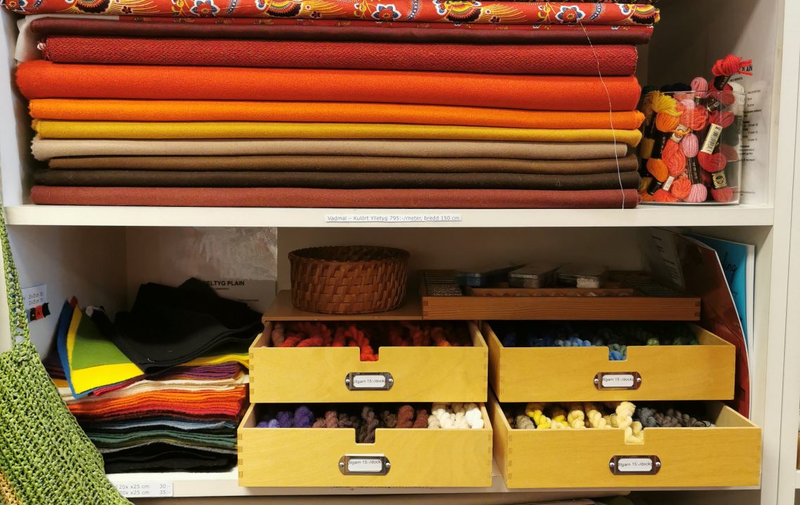 Här hittar du fina presenter i olika prisklasser och vill du slöjda själv så finns tyger, garner, knappar och ett stort utbud av band, sådant som idag är svårt att finna. I butikens bokhylla finns ett litet sortiment av aktuell slöjdlitteratur.